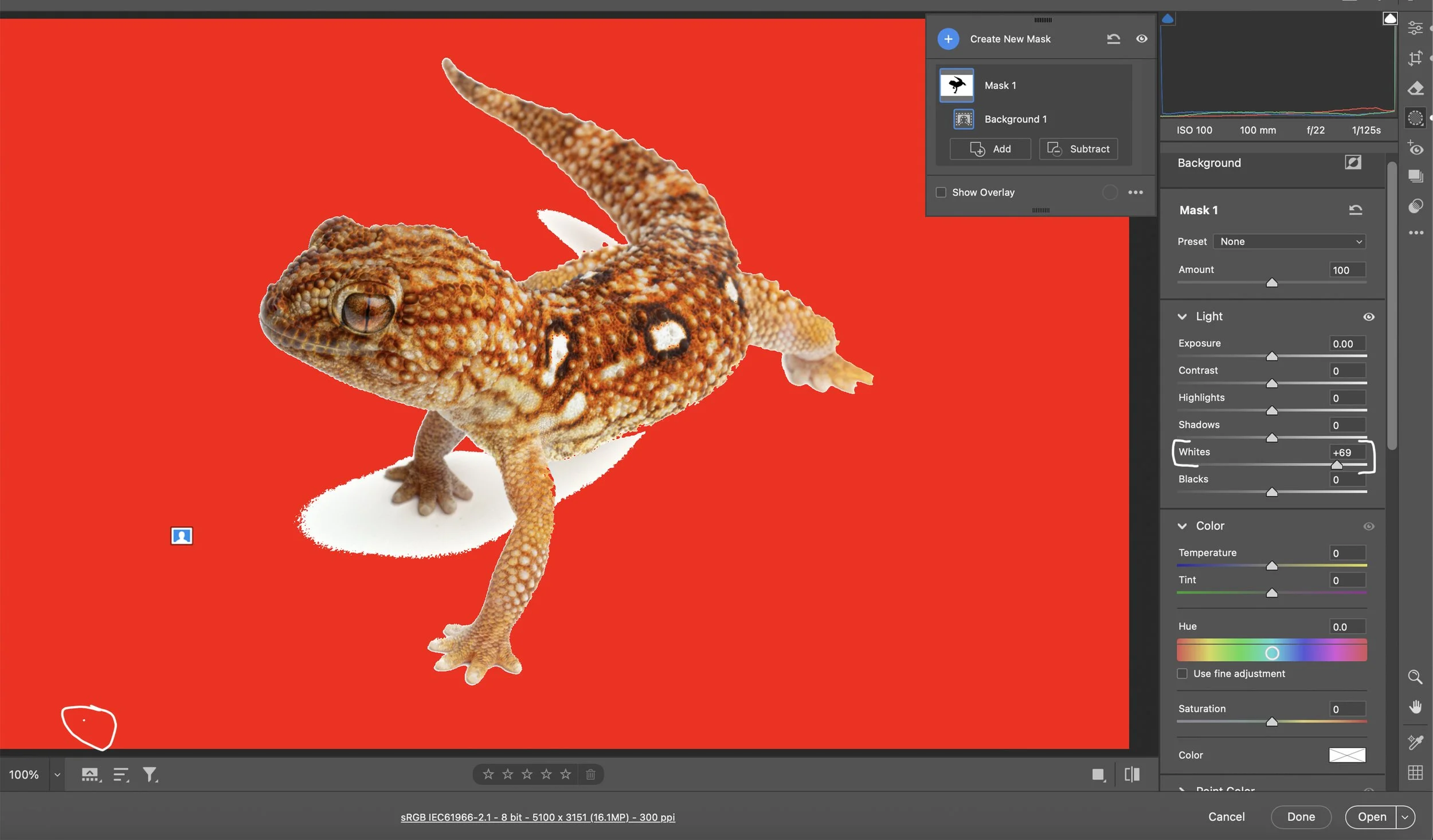 It’s time to make the background PURE WHITE! Click the Masking (M) icon in the right sidebar. The Masking Tool allows you to edit any sort of the image using a variety of tools to define the area you want to edit. Click on the Background in Create New Mask. Once it is clicked, it will show an overlay of the background (red). You’re going to want to uncheck Show Overlay so you can see the white background. Next, click the Highlight clipping warning. It’s the black arrow in the top right of the Histogram. When it is clicked, it will show the areas of the image that are completely white/blown out as the red in the image. Move the White Slider to the right until the background is pure white/blown out (it will show as red with the clipping warning turned on). I pushed the Whites Slider to +69, which made the background pure white. You will notice some artifacts in the image that will need to be removed from the background with the Remove Tool.
