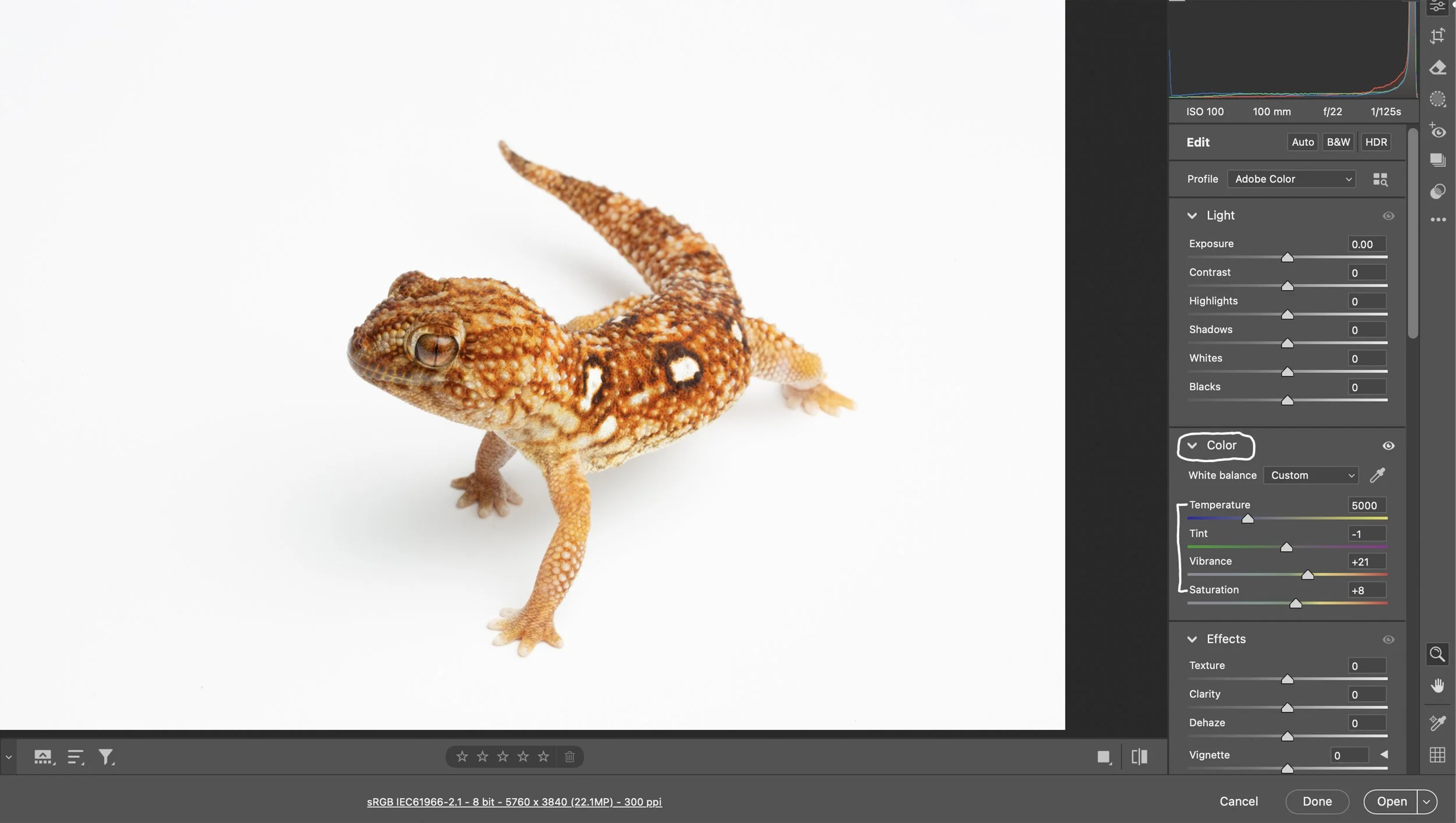 Next, let's move down to the Color sliders (White Balance - Temperature, Tint, Vibrance, and Saturation). I know my Elinchrom strobes are around 4900-5100K, but you can use a gray card to easily get the correct white balance by using the White Balance Eye Dropper Tool in ACR to sample the Camera Raw White Balance (18% gray) swatch on a gray card. It works like a charm, and you'll nail white balance every time. White balance is a creative decision, but I like the specimens to look as true to life as possible. The next slider is Tint. I rarely touch this slider and usually leave it as-is. After the Tint slider is Vibrance. It changes the saturation of the image without causing unpleasant color casts. I usually try to keep it around +20. The final slider in the Color Panel is Saturation. Stay conservative, y'all. Oversaturating an image is bush league. This Chondrodactylus angulifer needs a little saturation, so I pushed this slider to +8.