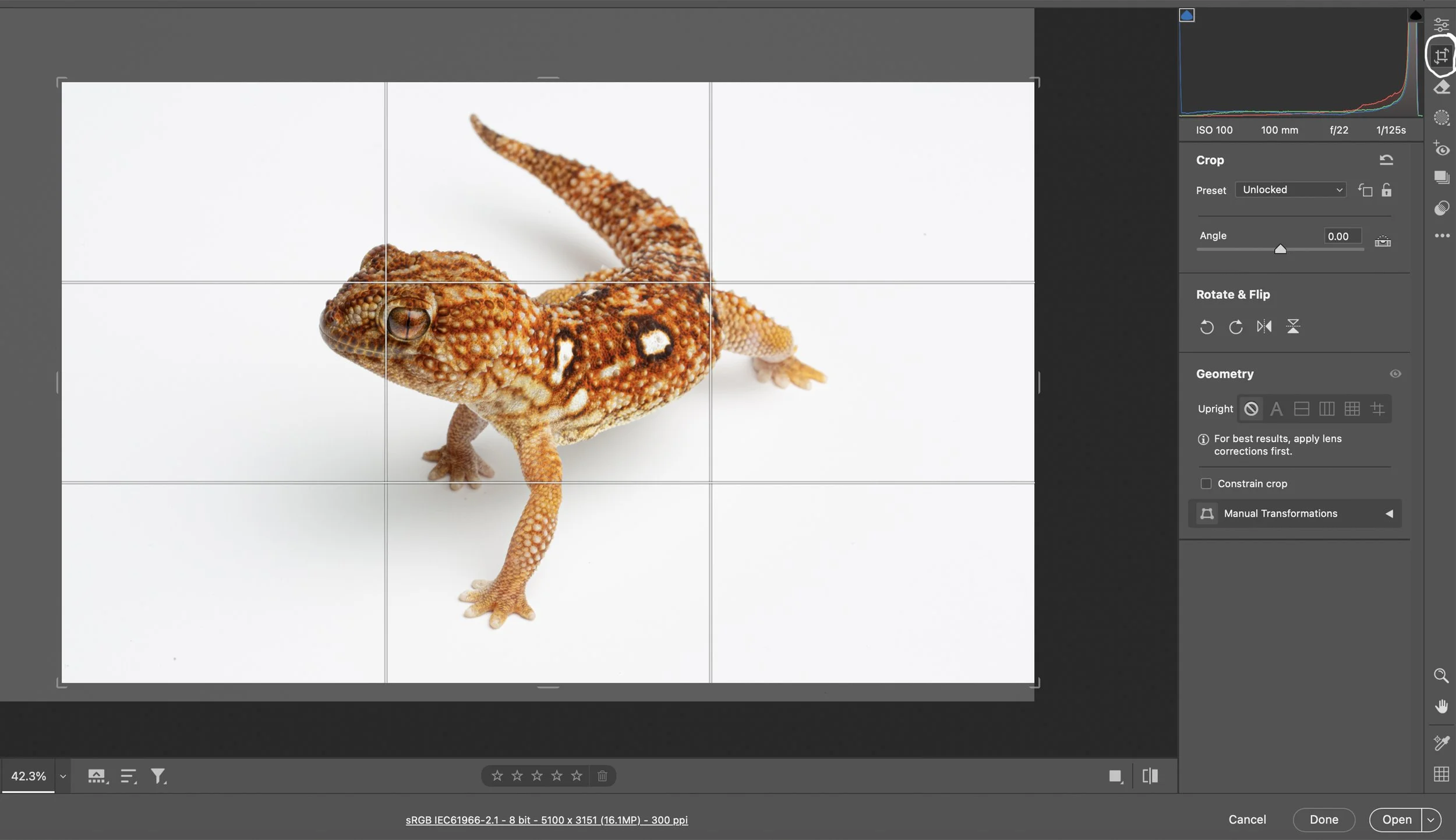 Next, I crop the image as needed, using the rule of thirds. The rule of thirds is a composition guideline in photography and art that suggests dividing an image into nine equal parts with two horizontal and two vertical lines, and placing key elements along these lines or at their intersections. I usually like to put the subject’s eye near one of the intersections as seen in this image.