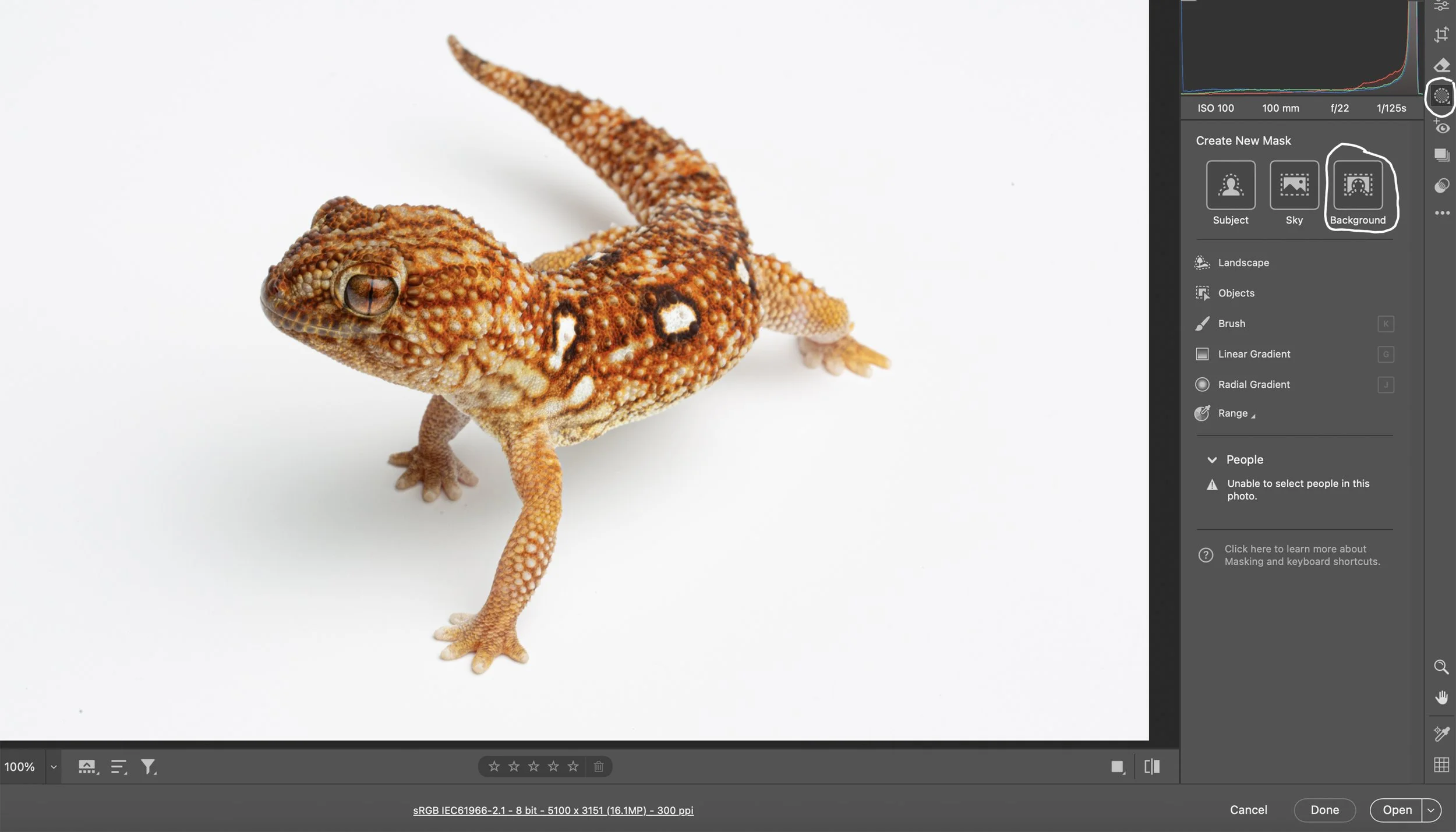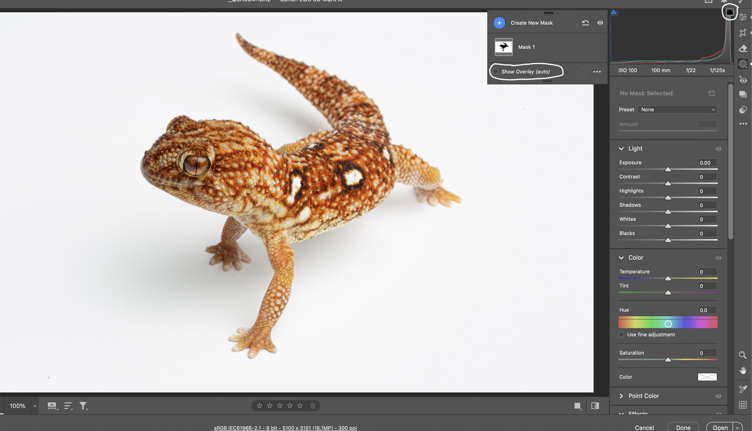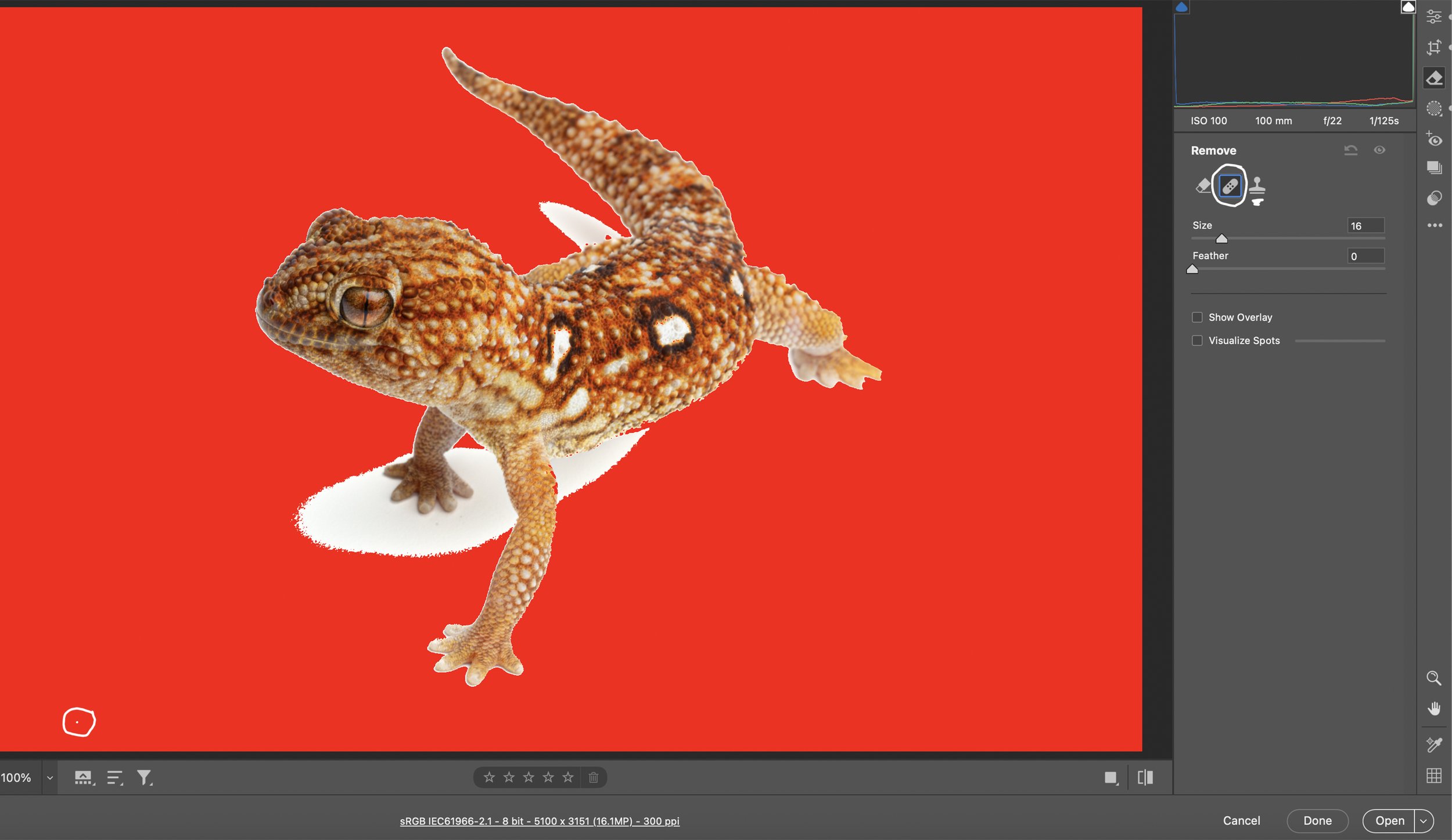 After masking the background, it’s time to remove all of the artifacts in the background before doing the final edits in Photoshop. Click on the Remove icon just above the Masking icon. You can use Heal or Clone to remove all of the artifacts in the background. Make sure that the Highlight clipping warning arrow is turned on because it makes it so easy to see artifacts in the white background. They will show as white specks/dots when the clipping warning is turned on while the rest of the white background will be red. Shadows under the subject will also appear white. I like to keep the faint shadows to add dimension to the image. Once you’re satisfied that all artifacts have been removed from the background, it’s time to open the image in Photoshop and do all of the final edits and output sharpen for web and/or print.