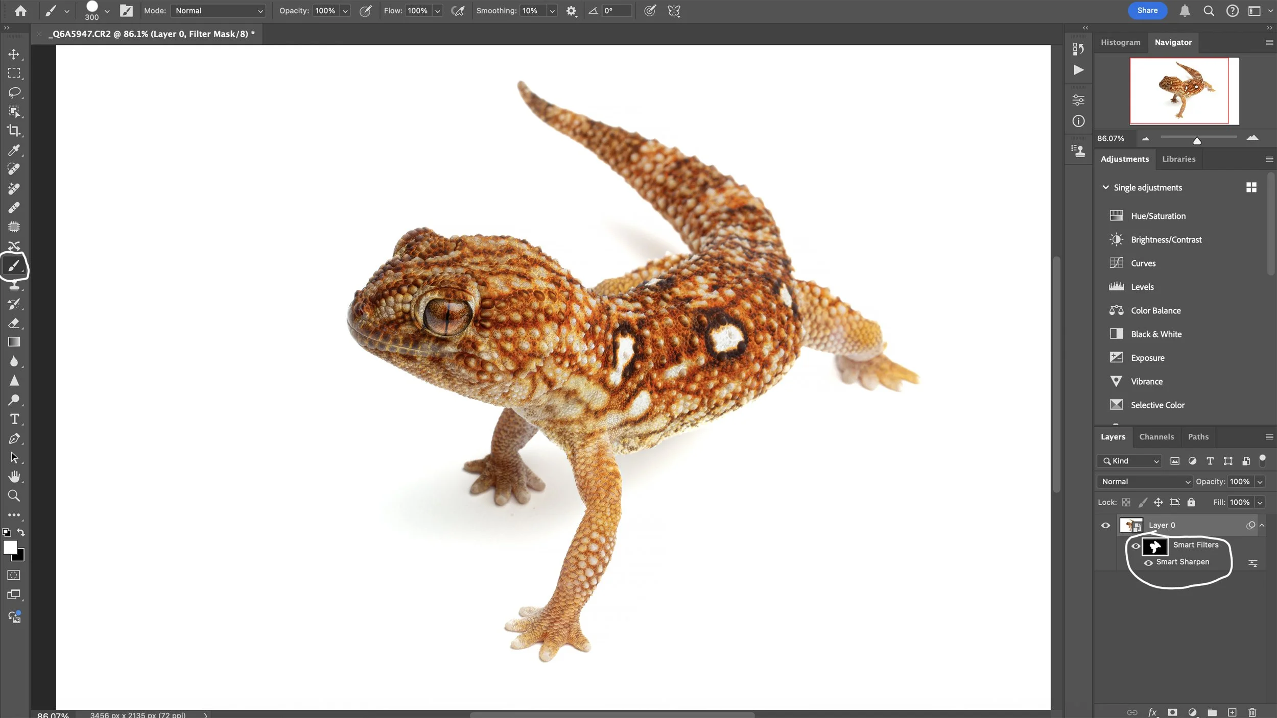After marks/artifacts/blemishes are removed, it’s time to output sharpen the image for print and/or web. Convert the image for Smart Filters, then use Smart Sharpen. The Amount for Print and Web can be the same, but the radius needs to be adjusted. Radius for print is 1.2-1.4 and 0.5-0.7 for web. Once the Smart Sharpen settings are set, click ok. Click on the Smart Filters layer and press Command “I” to invert the layer. Once it’s inverted, use the brush tool to paint the sharpening back into the subject. Done!