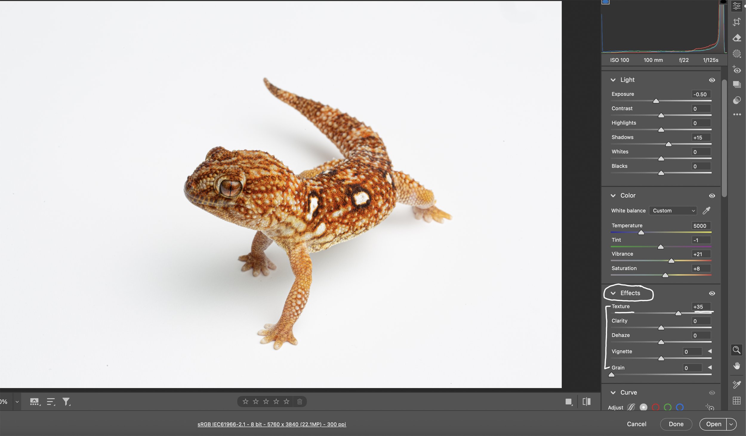 Next Panel is the Effects Panel. I really only use the Texture Slider in this panel because, quite frankly, the others are unnecessary. The Texture Slider is great for reptiles and amphibians. I pushed this one to +35 to show those prominent scales. I usually move this slider to the right +20 to +40. Sometimes I use the Clarity Slider to increase edge contrast.